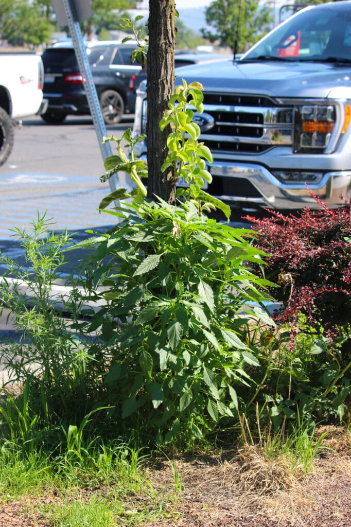 Thurman Johnson went to a Spokane, Washington Safeway on August 22, 2025 to gear up for a day of removing invasive garden loosestrife, but he ultimately stumbled upon a much more menacing weed lurking in that grocery store’s parking lot. One lone Palmer amaranth stalk towered three-feet tall in the parking lot’s landscaping island. At its roots were Palmer amaranth seedlings. A mess of bright red and yellow seeds gave the weed’s origin away: birdseed scattered by a well-meaning Safeway shopper.
