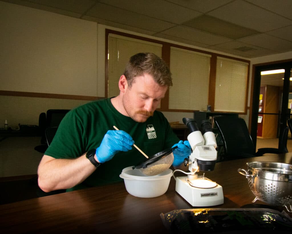Johnson sent samples of the suspected Palmer amaranth plants from the parking lot to the National Genotyping Center in North Dakota, which quickly confirmed that the southern weed had indeed rooted itself in Washington again. Johnson sent a warning email to researchers and state employees in the state of Washington who would want to know about the discovery – around 75 people. He was able to identify the brand of bird seed by working with Safeway employees and comparing the seeds found around the Palmer amaranth to the seeds in each bag. Then came the hard work – Johnson and a fellow county employee spent seven hours digging through store bought bird feed to identify each seed species in the bag, including Palmer amaranth seeds.